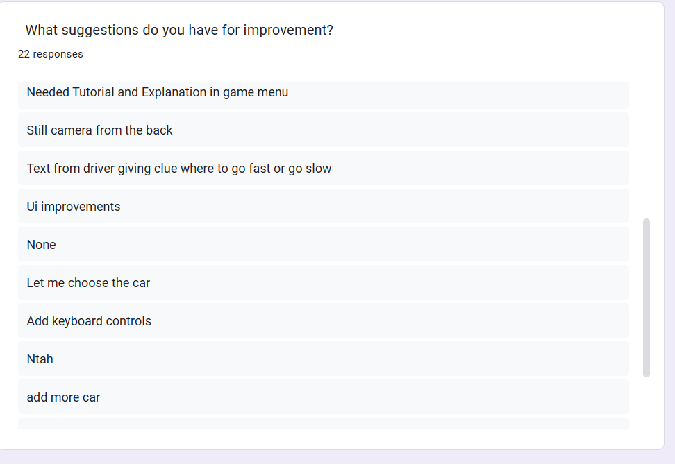 Based on player feedback, we have to make several adjustments to improve the game, including tweaking the AI difficulty, enhancing the UX, and give more replayability by adding more progression systems and cars customization.