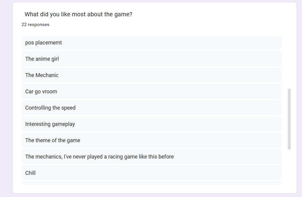 We gather more than 20 people to playtest the game and give feedback on the gameplay mechanics, difficulty balance, and overall enjoyment. This feedback was crucial in refining the game experience and ensuring it meets player expectations.